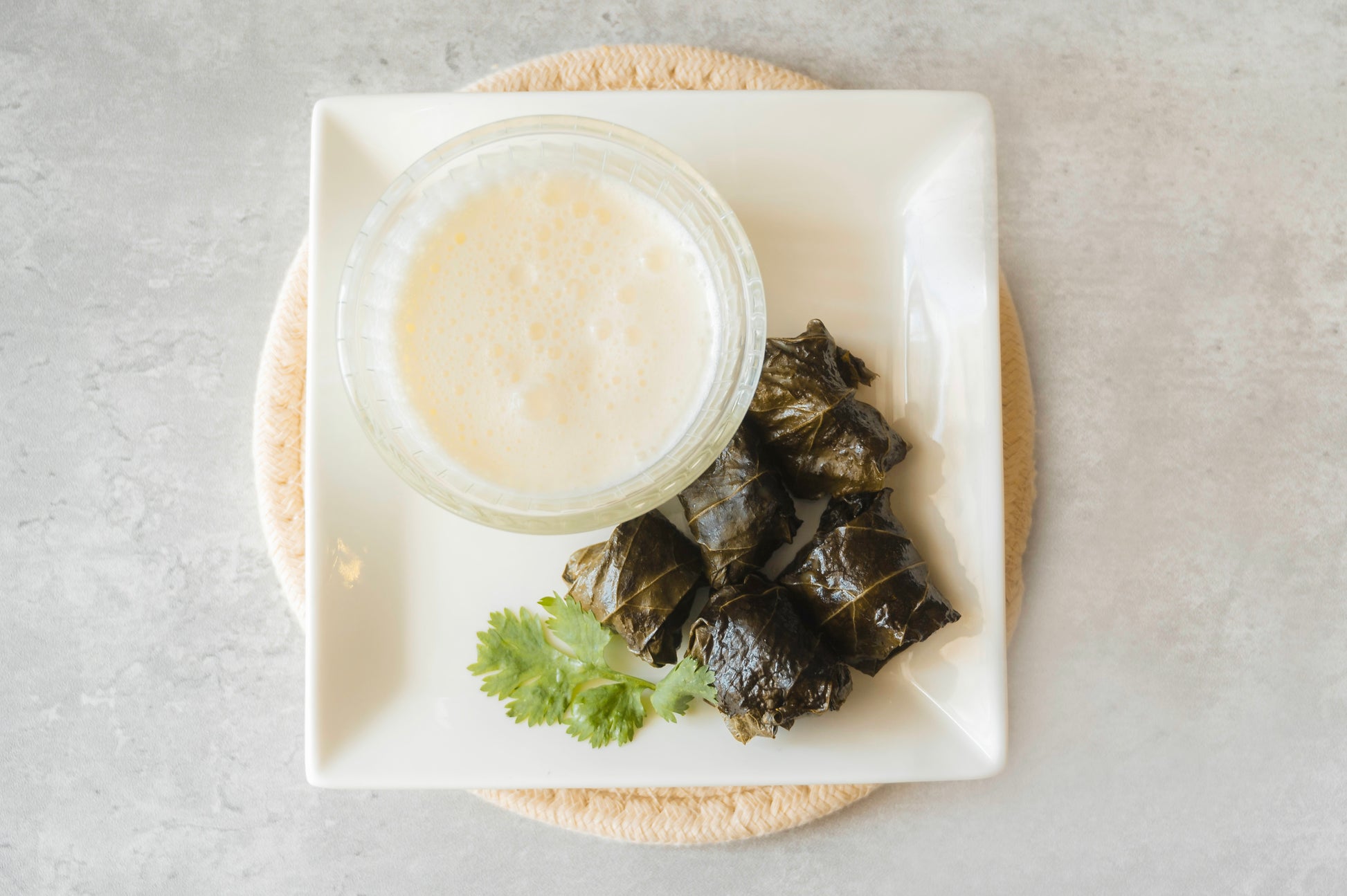 -rice and lentils wrapped in grape leaves. Served with garlic yogurt dip.